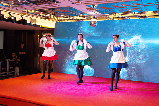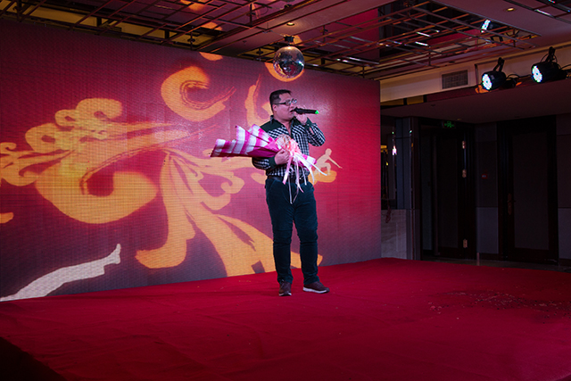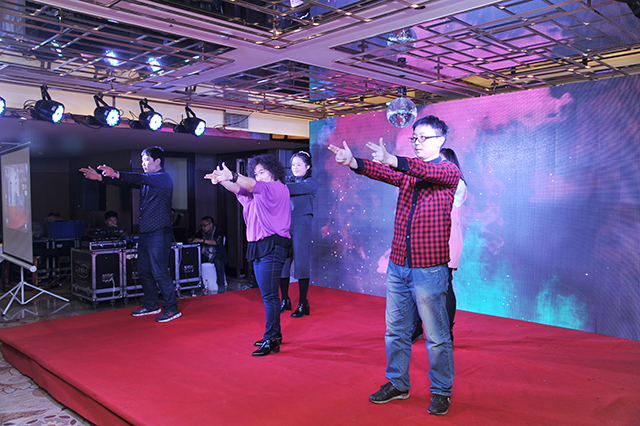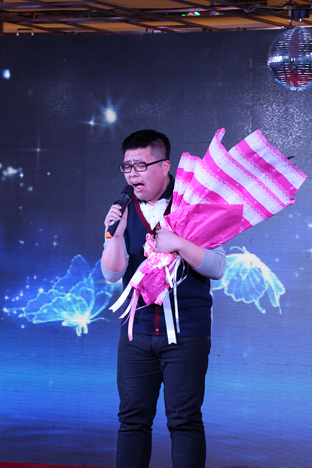 第二環(huán)節(jié)是生產(chǎn)制造部林秋楓的脫口秀《生活真煩惱》,搖身一變知心大姐和我們嘮嘮家長(zhǎng)里短生活煩惱,最后一曲《社會(huì)搖》結(jié)束了“生活的煩惱”。不得不佩服林姐的好口才??!今年晚會(huì)節(jié)目的“亮眼之作”小品《綁匪》,真是讓人眼前一片那啥啊(此處省略不說(shuō))。營(yíng)銷部的賈殿鵬和市場(chǎng)部的王元峰為了節(jié)目也是蠻拼的啦。賈經(jīng)理那一頭金色長(zhǎng)發(fā)、和王經(jīng)理那喜慶的肚兜兒,相信大家還是記憶猶新吧!集驚悚、懸疑、搞笑于一身的小品過(guò)后,在工程技術(shù)部夏寰宇的一首《你是我的眼》的歌聲中節(jié)目告一段落。之后游戲《看數(shù)字猜成語(yǔ)》、《背連背,心連心》火熱進(jìn)行。同時(shí)由領(lǐng)導(dǎo)抽取幸運(yùn)二等獎(jiǎng)并頒發(fā)獎(jiǎng)項(xiàng)。